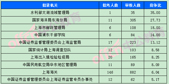 截止到1日16時,通過審核人數前三位的部門依次是:上海市國家稅務局,上海海關,國家海洋局東海分局三部門通過審核總人數達2817人,占通過審核總人數的72.12%。