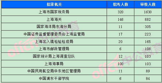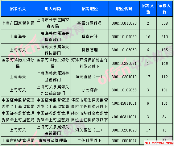 報名通過審核人數前十的職位主要集中在上海市國家稅務局、上海海關等部門,具體信息如下: