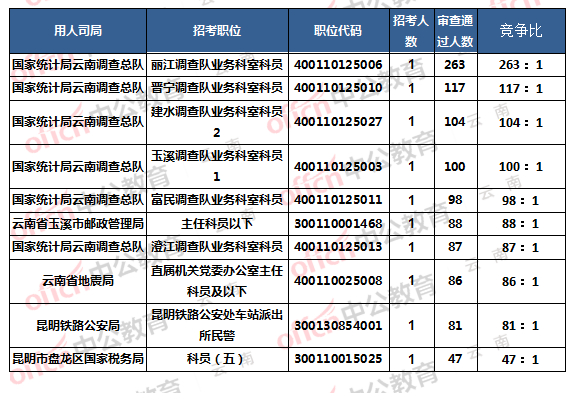 截止11月1日18時,國考報名第三天,國家統(tǒng)計局云南調(diào)查總隊,麗江調(diào)查隊業(yè)務(wù)科室科員,職位代碼:400110025006,招錄1人,審查通過人數(shù)為263人,具體信息如下: