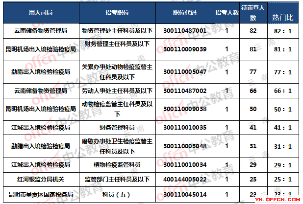 當(dāng)前最受歡迎的崗位是云南儲備物資管理局,物資管理處主任科員及以下,職位代碼:300110487001 ,招錄1人,82人處于待審狀態(tài),詳情如下圖: