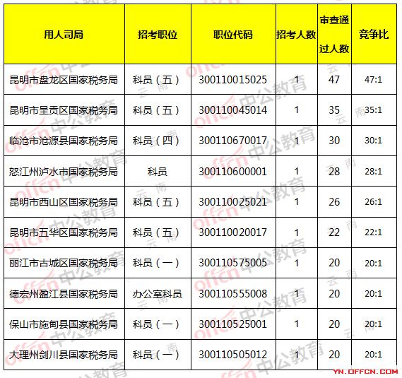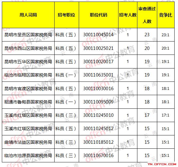 國考報名人數(shù)總待審核的共2666人,國稅有1369人待審,當前是昆明市呈貢區(qū)國家稅務局職位代碼300110045014的崗位相比報名人數(shù)為多,招1人,23人報名待審,35人報名審核通過,熱門比為:23:1