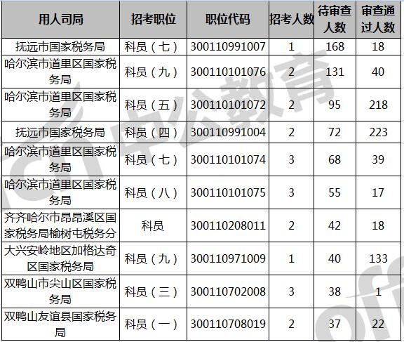 截止1日16時(shí)黑龍江省國(guó)家稅務(wù)局有2018人待審,占所有目前待審人數(shù)的55.32%,當(dāng)前待審人數(shù)最多的是撫遠(yuǎn)市國(guó)家稅務(wù)局,職位代碼300110991007一職,招1人,168人報(bào)名待審,18人報(bào)名審核通過(guò)。