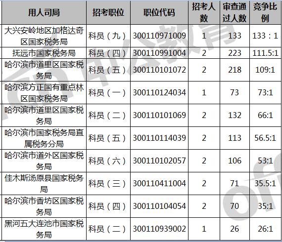 由于黑龍江省國(guó)家稅務(wù)局整體招錄人數(shù)比較多,所以部門整體競(jìng)爭(zhēng)比例比較小,但從招錄人數(shù)最多的和競(jìng)爭(zhēng)比例的職位來(lái)看,前三名都集中在該部門。當(dāng)前是大興安嶺地區(qū)加格達(dá)奇區(qū)國(guó)家稅務(wù)局職位代碼300110971009的崗位競(jìng)爭(zhēng)比例,達(dá)133:1。