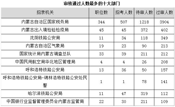 截止到11月1日16時,通過審核人數(shù)前三位的部門依次是:內蒙古自治區(qū)國家稅務局、內蒙古出入境檢驗檢疫局、沈陽鐵路公安局,三部門通過審核總人數(shù)達4655人,占通過審核總人數(shù)的73.59%。