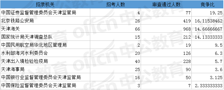 為幫助廣大考生更清晰的了解今日報名情況,中公網(wǎng)校整理了審核通過人數(shù)前十位的部門以及競爭比例最激烈的十大部門,供廣大考生參考: