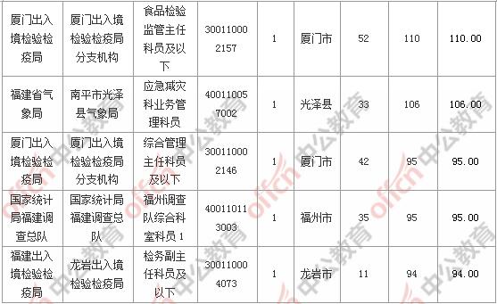 報名通過審核人數(shù)前十的職位主要集中在廈門出入境檢驗檢疫局、國家統(tǒng)計局福建調(diào)查總隊、廈門海關(guān),具體信息如下: