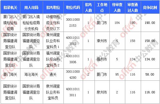 截止到1日16時,競爭比例的職位為廈門出入境檢驗檢疫局廈門出入境檢驗檢疫局分支機構(gòu)動植物檢疫主任科員及以下300110002153一職,招錄1人,截止到2日9時通過人數(shù)為190人,競爭比例190:1!