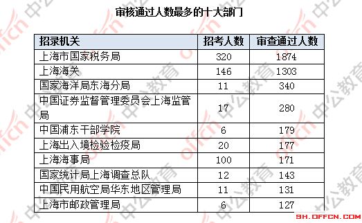 截止到2日9時(shí),通過(guò)審核人數(shù)前三位的部門(mén)依次是:上海市國(guó)家稅務(wù)局,上海海關(guān),國(guó)家海洋局東海分局,三部門(mén)通過(guò)審核總?cè)藬?shù)達(dá)3517人,占通過(guò)審核總?cè)藬?shù)的69.96%。
