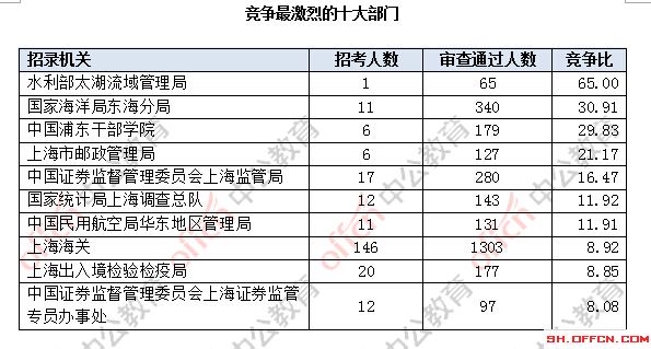 為幫助廣大考生更清晰的了解今日?qǐng)?bào)名情況,中公網(wǎng)校整理了審核通過(guò)人數(shù)前十位的部門(mén)以及競(jìng)爭(zhēng)比例最激烈的十大部門(mén),供廣大考生參考:審核通過(guò)人數(shù)最多的十大部門(mén)