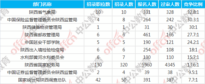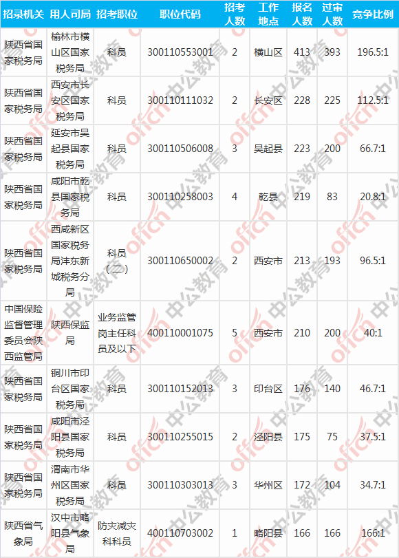 報名人數(shù)前十的職位主要集中在陜西省國家稅務(wù)局、中國保險監(jiān)督管理委員會陜西監(jiān)管局、陜西省氣象局等部門,具體信息如下: