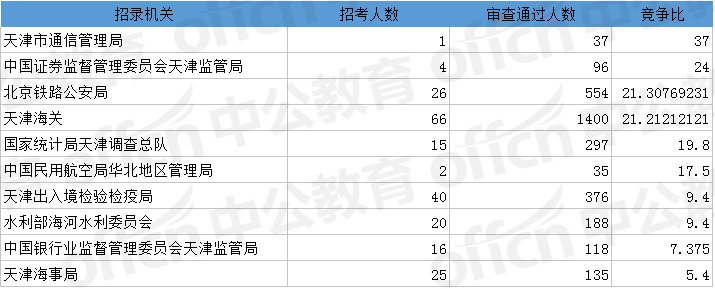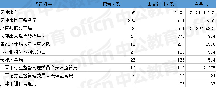 為幫助廣大考生更清晰的了解今日報名情況,中公網(wǎng)校整理了審核通過人數(shù)前十位的部門以及競爭比例最激烈的十大部門,供廣大考生參考:
