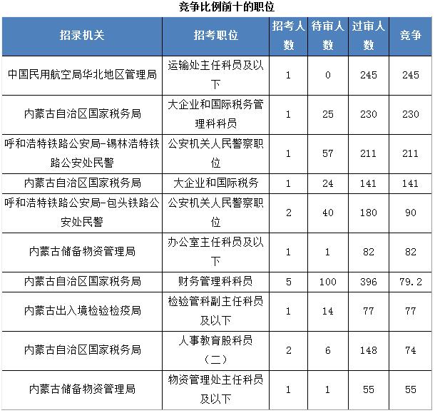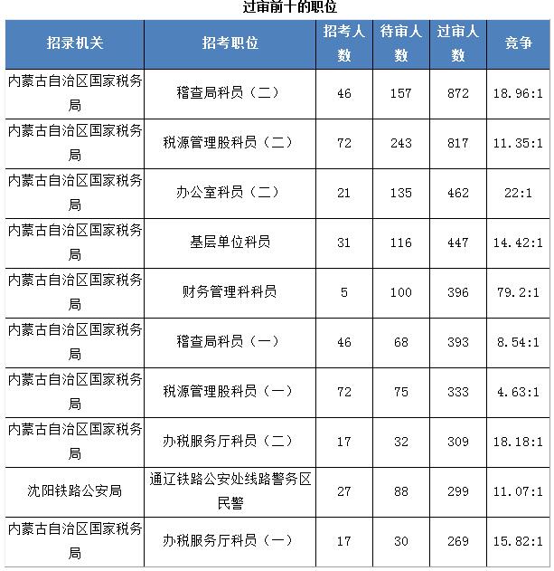 通過審核人數(shù)最多的前十個職位中內(nèi)蒙自治區(qū)國家稅務局占了9席,其中稽查局科員(二)、 通過審核人數(shù)為872人,管理股科員(二)審核人數(shù)為817人,競爭比例分別為18.96:1與11.35:1.具體信息如下: