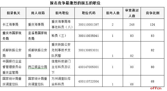 報名通過審核人數(shù)前五的職位主要集中在中國銀行業(yè)監(jiān)督管理委員會重慶監(jiān)管局、長江海事局、重慶市國家稅務局等部門,具體信息如下:
