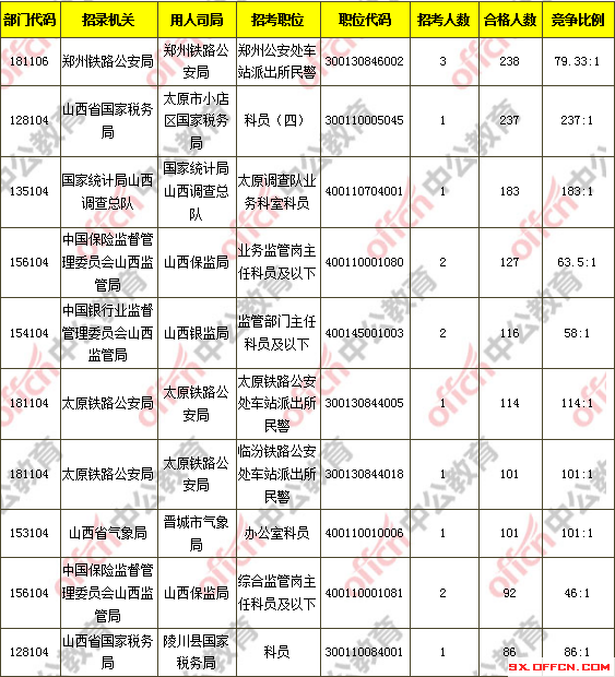 報(bào)名通過審核人數(shù)前十的職位主要集中在鄭州鐵路公安局、山西省國家稅務(wù)局、國家統(tǒng)計(jì)局山西調(diào)查總隊(duì)等部門,具體信息如下: