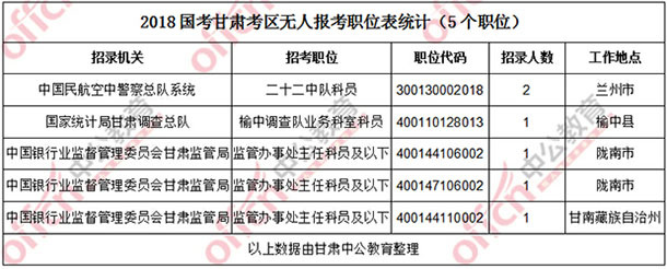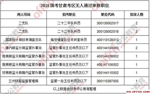 11月4日16時(shí),工作地點(diǎn)在甘肅的職位共有8個(gè)職位無人通過審核,占全部職位的3.7%,5個(gè)職位無人報(bào)考,占全部職位的2.3%。下面是無人待審及無人報(bào)報(bào)職位一覽表,中公網(wǎng)校專家建議廣大考生多關(guān)注一些較冷職位,避免激烈競(jìng)爭(zhēng),結(jié)合自身?xiàng)l件,找到屬于自己的職位。
