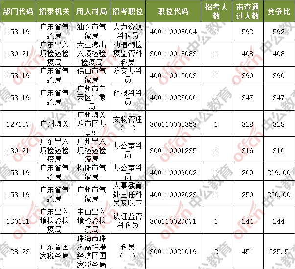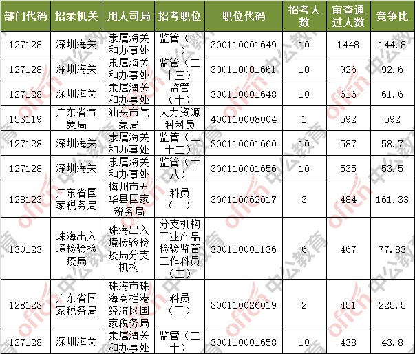 報(bào)名通過審核人數(shù)前十的職位主要集中在深圳海關(guān)、廣東省氣象局、廣東省國(guó)家稅務(wù)局等部門,具體信息如下: