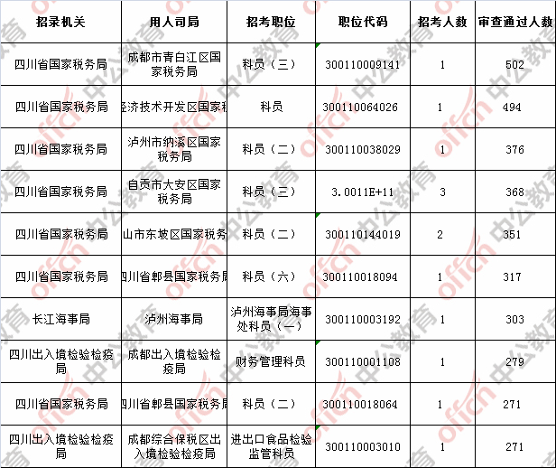 第五日?qǐng)?bào)名通過(guò)審核人數(shù)前十的職位主要集四川省國(guó)家稅務(wù)局等部門,具體信息如下: