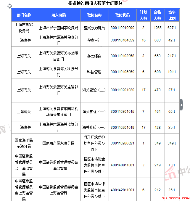 報(bào)名通過審核人數(shù)前十的職位主要集中在上海市國家稅務(wù)局、上海海關(guān)、國家海洋局東海分局等部門,具體信息如下: