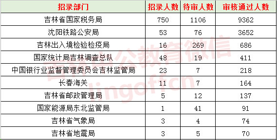 截止到11月4日16時,通過審核人數(shù)前三位的部門依次是:吉林省國家稅務(wù)局、沈陽鐵路公安局、吉林出入境檢驗檢疫局,三部門通過審核總?cè)藬?shù)達13700人,占通過審核總?cè)藬?shù)的91.18%。