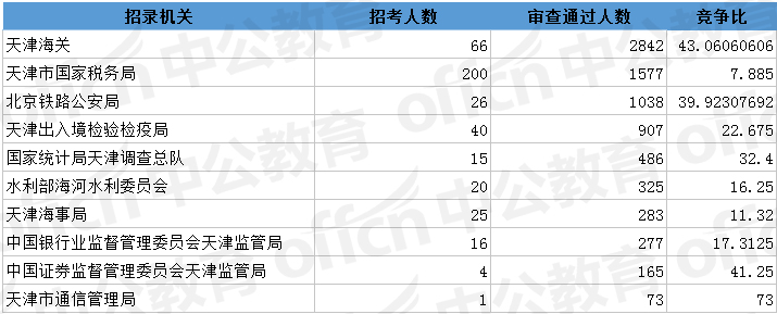 為幫助廣大考生更清晰的了解今日報名情況,中公網(wǎng)校整理了審核通過人數(shù)前十位的部門以及競爭比例最激烈的十大部門,供廣大考生參考: