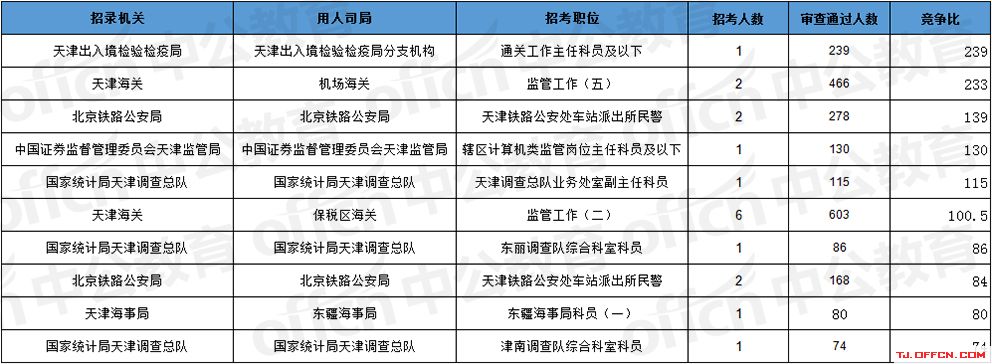報(bào)名通過審核人數(shù)前十的職位主要集中在天津海關(guān)、北京鐵路公安局、天津出入境檢驗(yàn)檢疫局等部門,具體信息如下:
