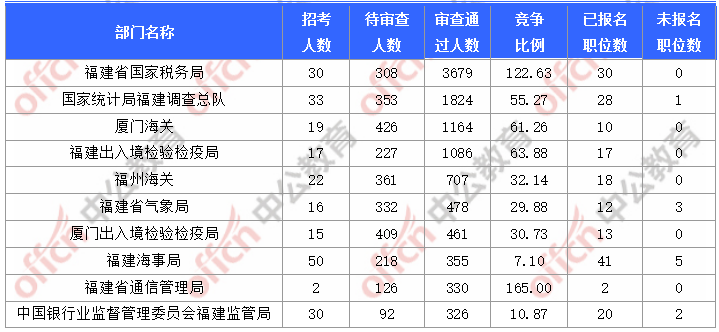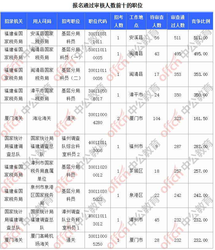 報名通過審核人數(shù)前十的職位主要集中在福建省國家稅務(wù)局、廈門海關(guān)、國家統(tǒng)計局福建調(diào)查總隊等部門,具體信息如下: