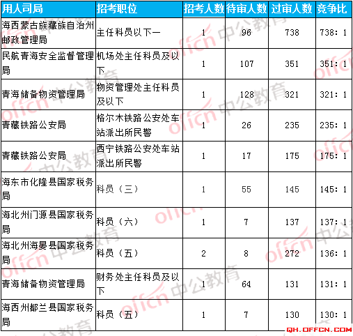 以下是4日16時(shí)各部門(mén)報(bào)名人數(shù)統(tǒng)計(jì)分析,其中中國(guó)民航青海安全監(jiān)督管理局、青海省物資儲(chǔ)備管理局、青海省郵政管理局等三個(gè)部門(mén)競(jìng)爭(zhēng)最激烈,競(jìng)爭(zhēng)比均已超過(guò)144:1。