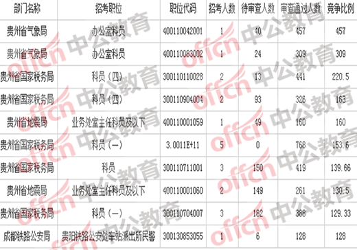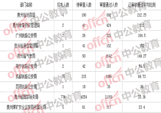 截止到5日16時,通過審核人數(shù)前三位的部門依次是:貴州省國家稅務(wù)局、北貴州省氣象局、成都鐵路公安局,三部門通過審核總?cè)藬?shù)達24644人,占通過審核總?cè)藬?shù)的90%。