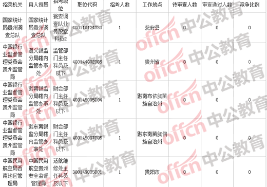 截至11月5日16時,據(jù)中公網(wǎng)校統(tǒng)計,國考職位中工作地點在貴州的職位通過審核總?cè)藬?shù)為27901人,共有8個職位無人通過審核,平均競爭比例為33:1。