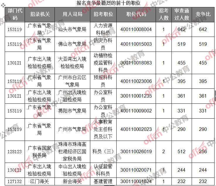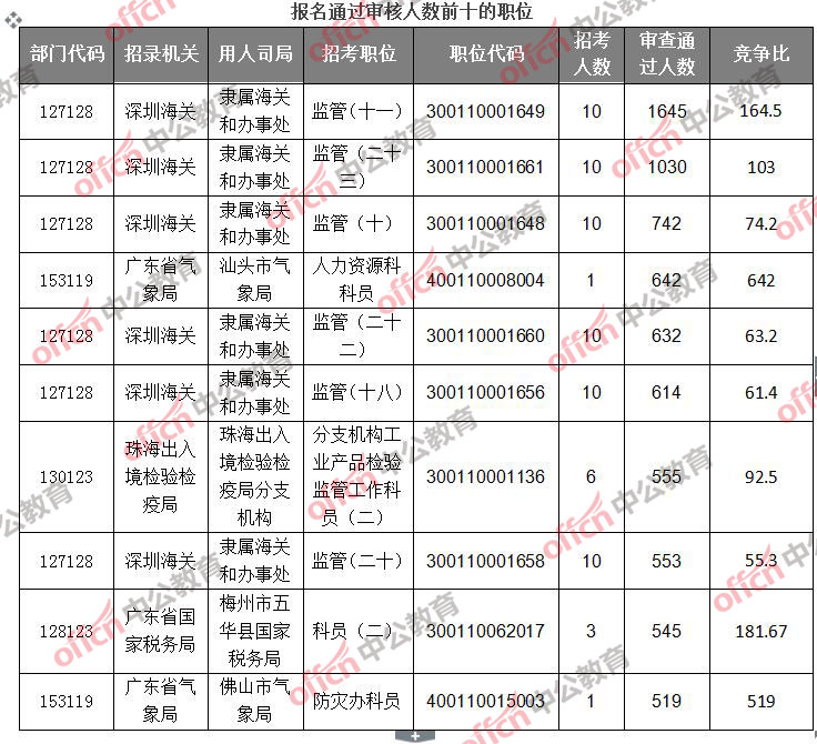 報(bào)名通過(guò)審核人數(shù)前十的職位主要集中在深圳海關(guān)、廣東省氣象局、廣東省國(guó)家稅務(wù)局等部門,具體信息如下: