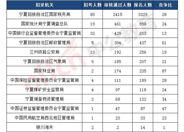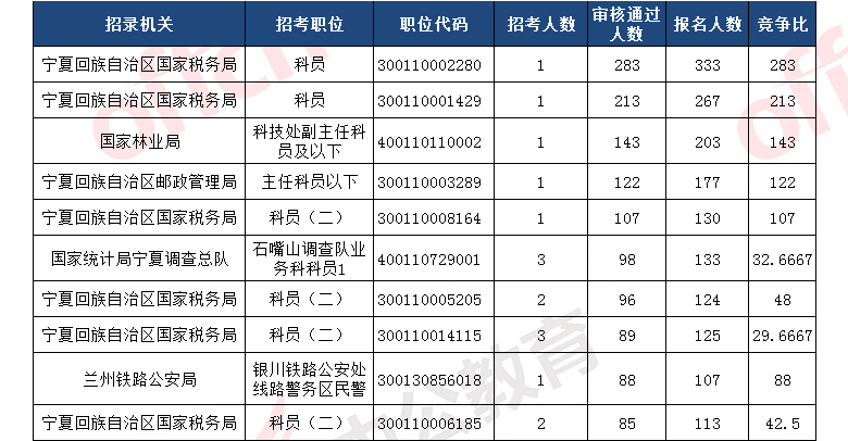截止到11月6日9時,報名通過審核人數(shù)前十的職位主要為寧夏回族自治區(qū)國家稅務(wù)局、國家林業(yè)局,具體信息如下: