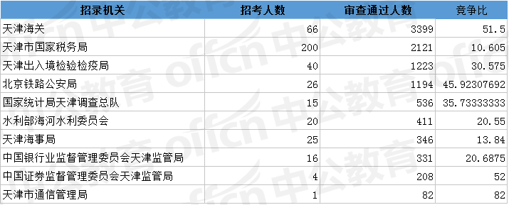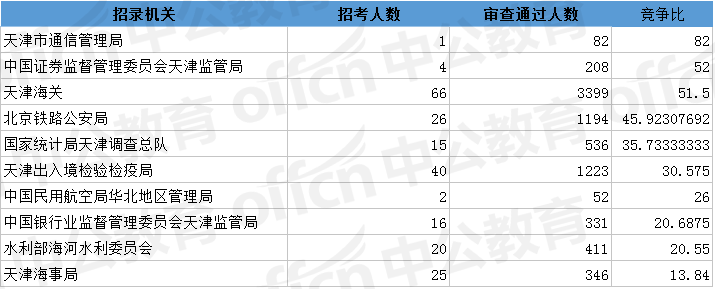 為幫助廣大考生更清晰的了解今日?qǐng)?bào)名情況,中公網(wǎng)校整理了審核通過(guò)人數(shù)前十位的部門以及競(jìng)爭(zhēng)比例最激烈的十大部門,供廣大考生參考: