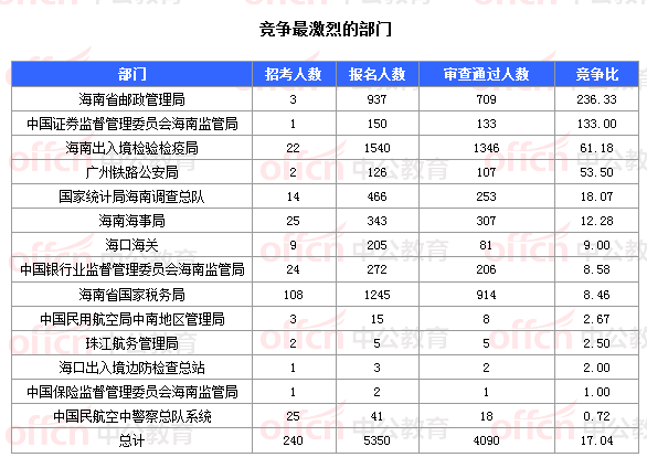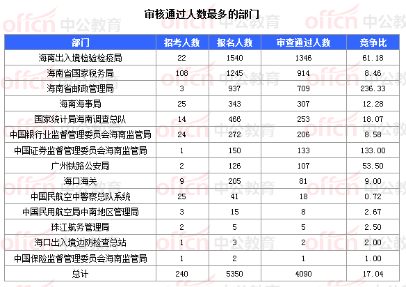 截至11月6日16時,據(jù)中公網(wǎng)校統(tǒng)計,國考職位中工作地點在海南的職位通過審核總?cè)藬?shù)為4090人,共有10個職位無人通過審核,其中還有部分待審核的人數(shù)高達1260人,平均競爭比例為17.04:1。