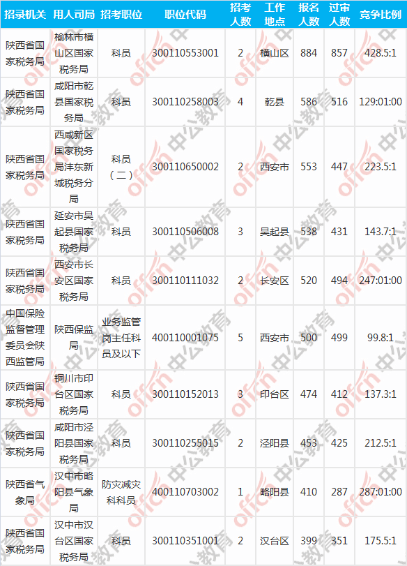 報(bào)名人數(shù)前十的職位主要集中在陜西省國(guó)家稅務(wù)局、中國(guó)保險(xiǎn)監(jiān)督管理委員會(huì)陜西監(jiān)管局、陜西省氣象局等部門(mén),具體信息如下: