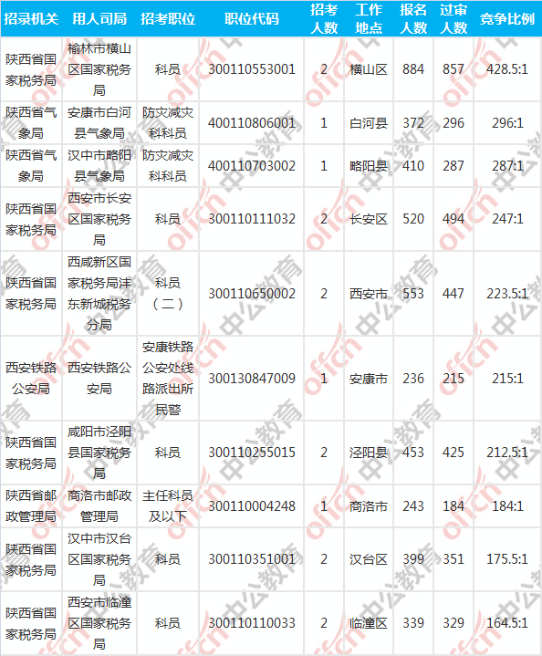 截至到6日16時(shí),工作地點(diǎn)在陜西的職位共有3個(gè)無(wú)人報(bào)考,占全部職位的1%。下面是無(wú)人報(bào)考職位一覽表,中公網(wǎng)校專(zhuān)家建議廣大考生多關(guān)注一些較冷職位,避免激烈競(jìng)爭(zhēng),結(jié)合自身?xiàng)l件,找到屬于自己的職位。