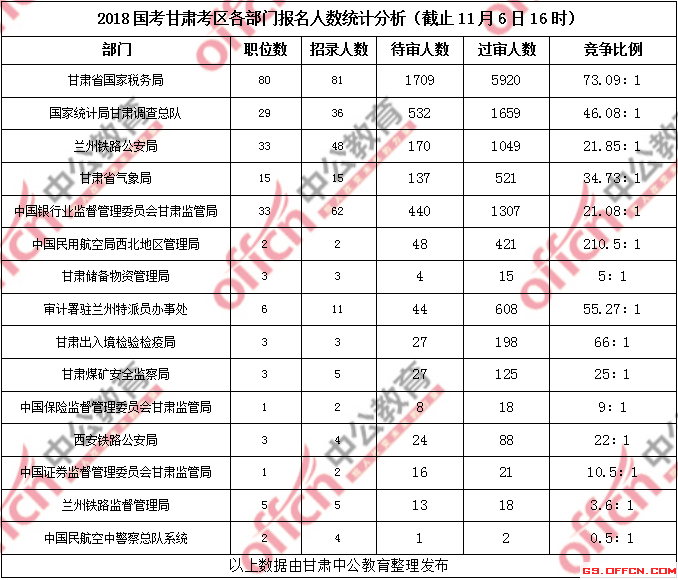 [11月6日16時]甘肅2018國考報名人數(shù)統(tǒng)計:過審11970人 平均競爭比例42.3:1