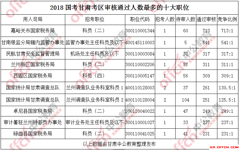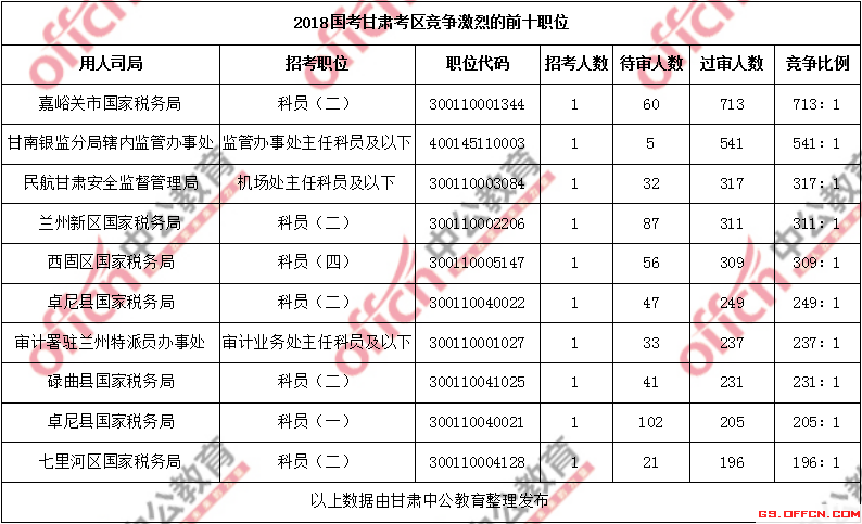 報名通過審核人數(shù)前十的職位主要集中在嘉峪關(guān)市國家稅務(wù)局、甘南銀監(jiān)分局轄內(nèi)監(jiān)管辦事處、民航甘肅安全監(jiān)督管理局部門,具體信息如下: