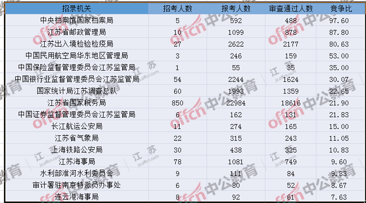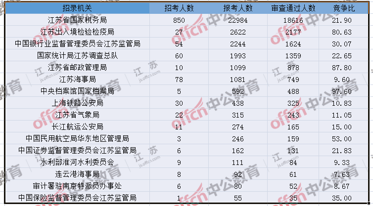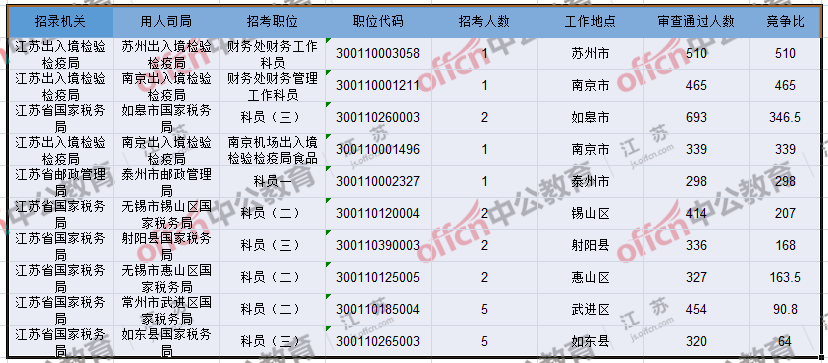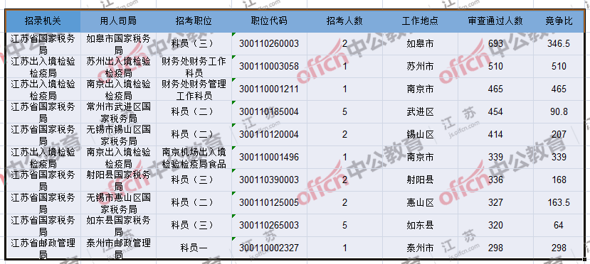 報(bào)名通過(guò)審核人數(shù)前十的職位主要集中在江蘇出入境檢驗(yàn)檢疫局、江蘇省郵政管理局、江蘇省國(guó)家稅務(wù)局等部門(mén),具體信息如下: