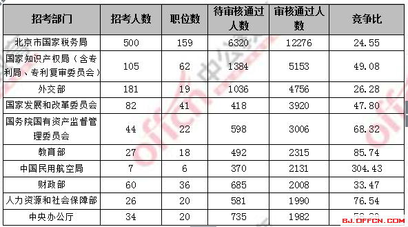 本次國考,北京國稅是北京地區(qū)招錄人數(shù)最多的部門,共招錄500人,目前審核通過的人數(shù)為12276人,待審核人數(shù)為6320,競(jìng)爭(zhēng)比為25:1,這也能看得出考生對(duì)于學(xué)生對(duì)于國稅的喜愛。在報(bào)名最多的10個(gè)部門中,由于大部分中央部門都在北京,所以這也是北京整體報(bào)考人數(shù)較多的原因。
