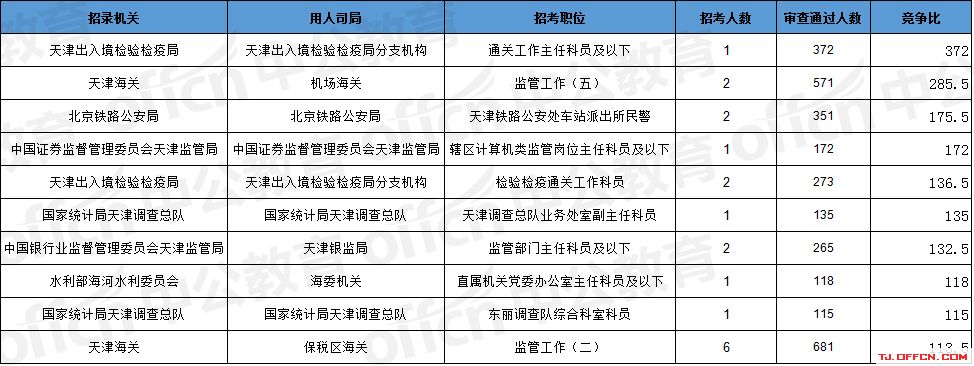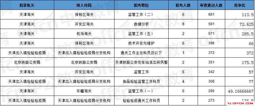 報(bào)名通過審核人數(shù)前十的職位主要集中在天津海關(guān)、北京鐵路公安局、天津出入境檢驗(yàn)檢疫局等部門,具體信息如下: