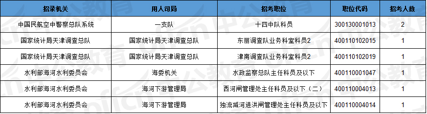 截止到7日09時(shí),工作地點(diǎn)在天津的職位共有6個(gè)無(wú)人報(bào)考,占全部職位的2.8%。下圖是無(wú)人報(bào)考職位一覽表,中公網(wǎng)校專家建議廣大考生多關(guān)注一些較冷職位,避免激烈競(jìng)爭(zhēng),結(jié)合自身?xiàng)l件,找到屬于自己的職位。