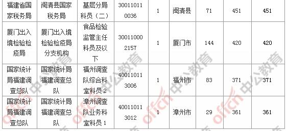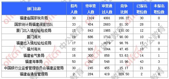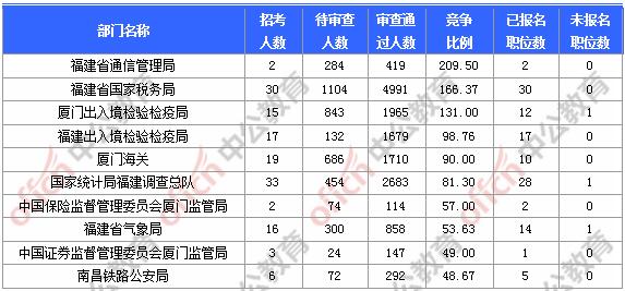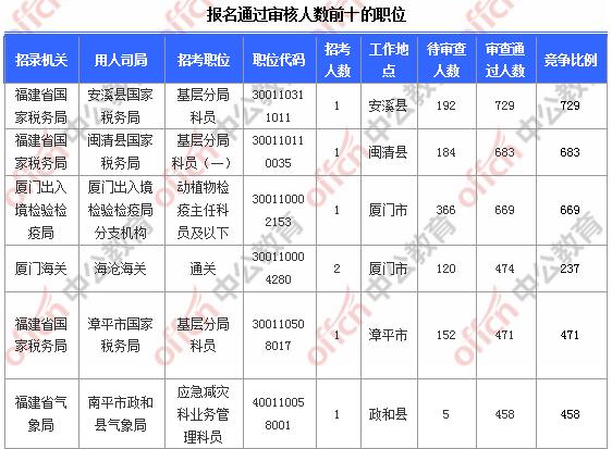 報(bào)名通過(guò)審核人數(shù)前十的職位主要集中在福建省國(guó)家稅務(wù)局、廈門(mén)出入境檢驗(yàn)檢疫局、廈門(mén)海關(guān),具體信息如下: