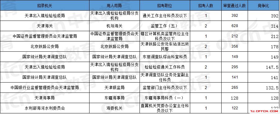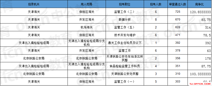 報名通過審核人數(shù)前十的職位主要集中在天津海關(guān)、北京鐵路公安局、天津出入境檢驗檢疫局等部門,具體信息如下:
