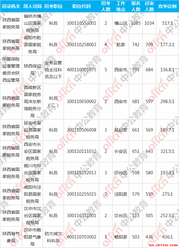 報(bào)名人數(shù)前十的職位主要集中在陜西省國家稅務(wù)局、中國保險(xiǎn)監(jiān)督管理委員會(huì)陜西監(jiān)管局、陜西省氣象局等部門,具體信息如下: