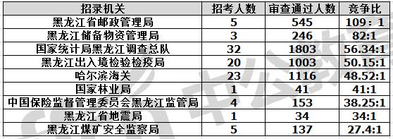 截止到11月7日16時(shí),通過審核人數(shù)前三位的部門依次是:黑龍江省國家稅務(wù)局、哈爾濱鐵路公安局、國家統(tǒng)計(jì)局黑龍江調(diào)查總隊(duì),三部門通過審核總?cè)藬?shù)達(dá)24892人,占通過審核總?cè)藬?shù)的85.28%。其中黑龍江省國稅局審核通過人數(shù),與去年同期相比增加了5595人。