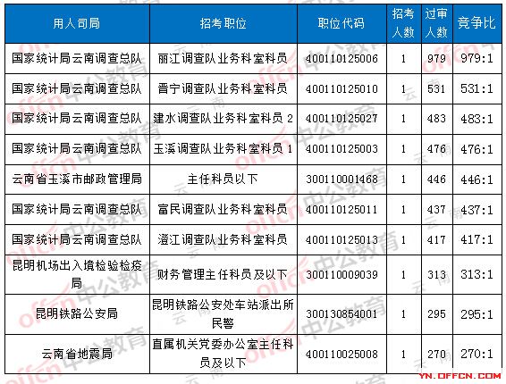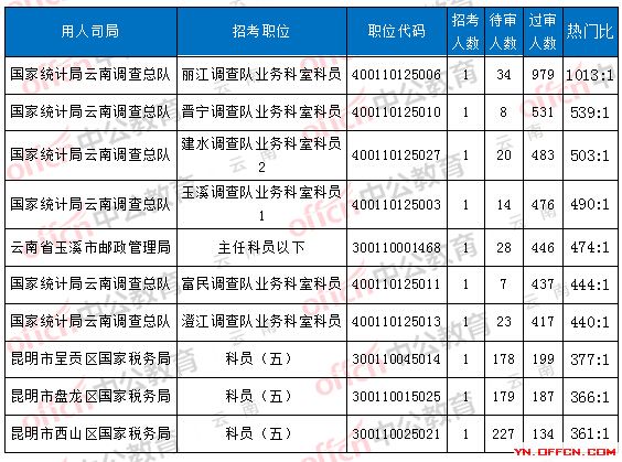 當(dāng)前最受歡迎的崗位是國家統(tǒng)計局云南調(diào)查總隊,麗江調(diào)查隊業(yè)務(wù)科室科員,職位代碼:400110125006,招錄1人,1013人報名,其中34人待審核通過,詳情如下圖:
