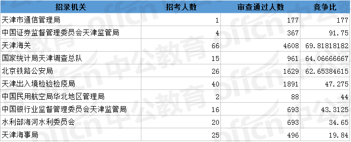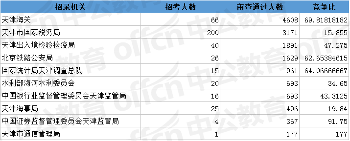 為幫助廣大考生更清晰的了解今日?qǐng)?bào)名情況,中公網(wǎng)校整理了審核通過(guò)人數(shù)前十位的部門(mén)以及競(jìng)爭(zhēng)比例最激烈的十大部門(mén),供廣大考生參考: