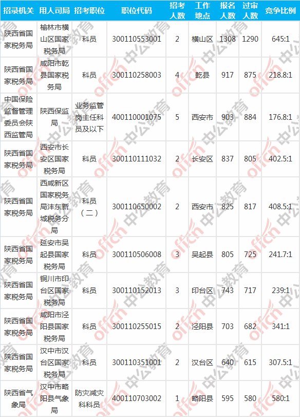 報(bào)名人數(shù)前十的職位主要集中在陜西省國家稅務(wù)局、中國保險(xiǎn)監(jiān)督管理委員會陜西監(jiān)管局、陜西省氣象局等部門,具體信息如下:
