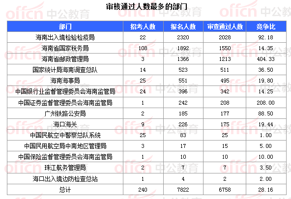 截止到8日16時,通過審核人數(shù)前三位的部門依次是:海南出入境檢驗檢疫局海南省國家稅務局、海南省郵政管理局、,三部門通過審核總人數(shù)達4791人,占通過審核總人數(shù)的70.09%。