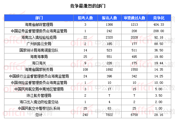 截至11月8日16時,據(jù)中公網(wǎng)校統(tǒng)計,國考職位中工作地點在海南的職位通過審核總人數(shù)為6758人,共有4個職位無人通過審核,其中還有部分待審核的人數(shù)高達1064人,平均競爭比例為28.16:1。
